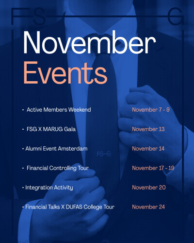 With over 2000 members, FSG is one of the most active and professional study associations in the Netherlands. FSG offers a wide range of sight-broadening events from an academic background. For example, FSG organises Inhouse Tours in fields like accountancy, financial controlling, financial consultancy, banking, and M&A. Thereby, FSG organises many network opportunities, like network socials and recruitment dinners. By offering these activities, we always try to close the gap between theory and practice.